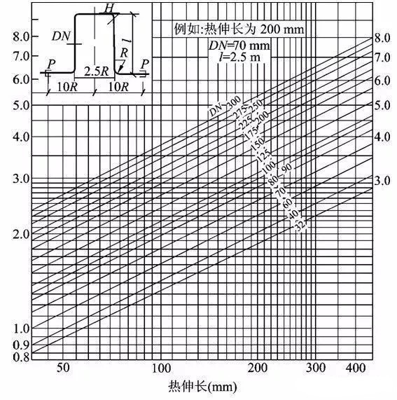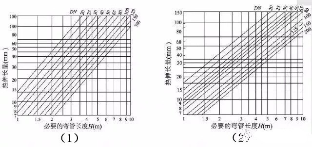 为简化计算,常用线算图来确定L型补偿器的短臂长度和Z型补偿器的中间臂长度。图二(1)是L型弯管段自然补偿线算图,(2)是Z型弯管段自然补偿线算图。